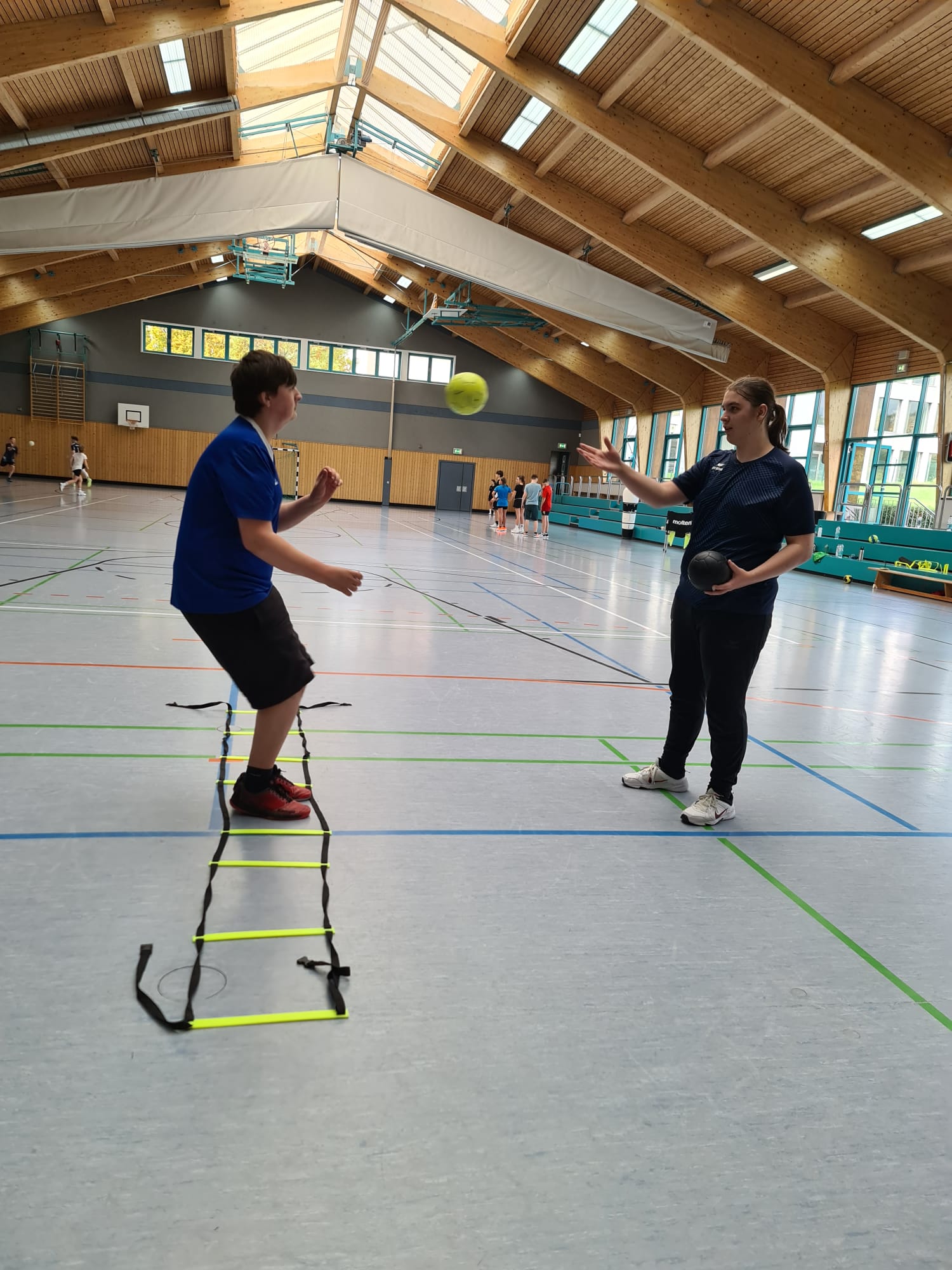 Auch Tag zwei startete sportlich mit einer flotten Erwärmung. Anschließend wurden erneut Fangen, Werfen und Prellen geübt, bevor es beim Techniktraining mit Sprungwürfen etwas anspruchsvoller wurde. Nachmittags stand wieder das Spiel auf dem Großfeld im Mittelpunkt.